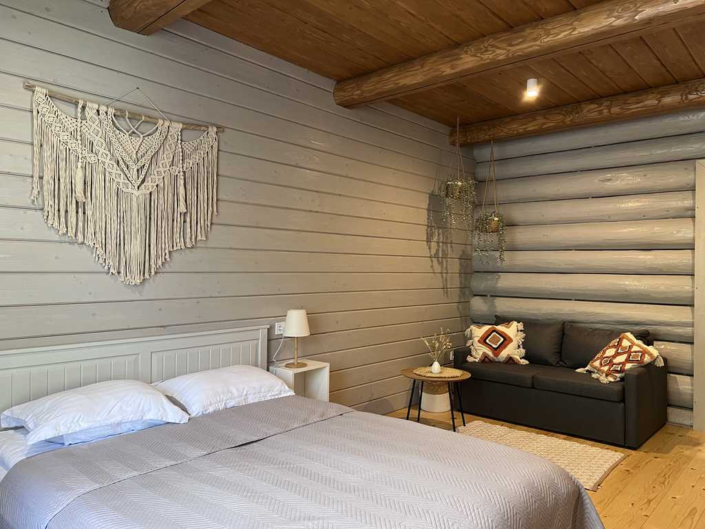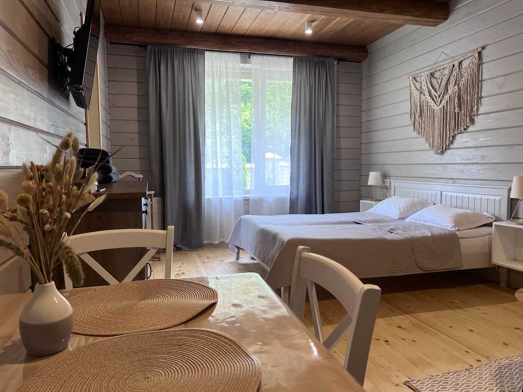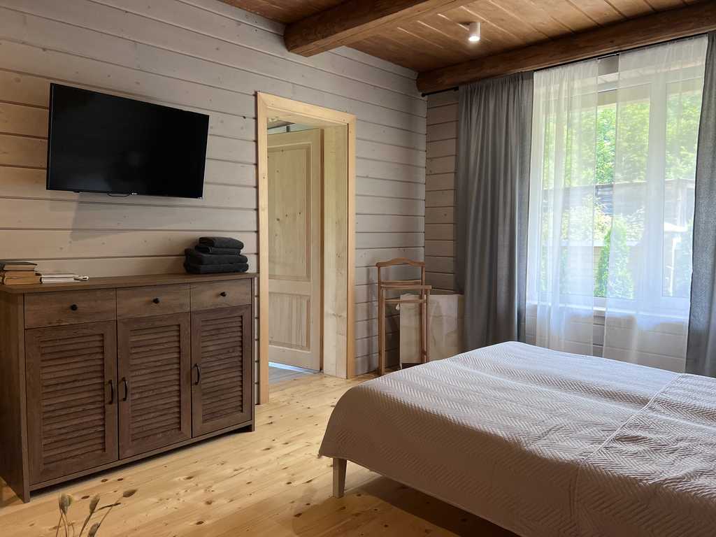 В кімнаті двоспальне ліжко, м’який диван (який розкладається), тумбочки, комод. Стабільний швидкісний інтернет Wi Fi (50-100Мбіт\сек). Smart TV. Безкоштовне Мегого.