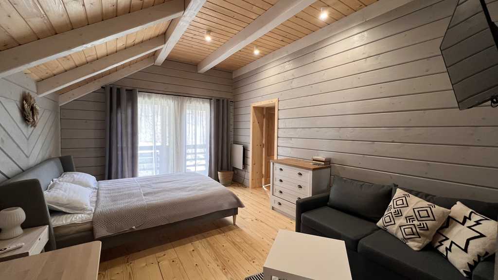 В кімнаті двоспальне ліжко, м’який диван (який розкладається), тумбочки, комод. Стабільний швидкісний інтернет Wi Fi (50-100Мбіт\сек). Smart TV. Безкоштовне Мегого.