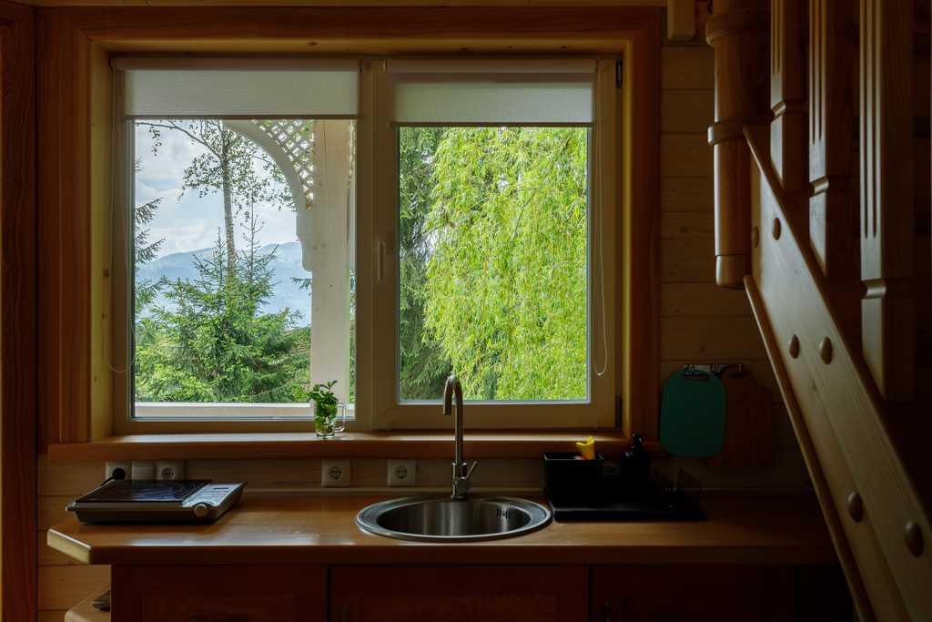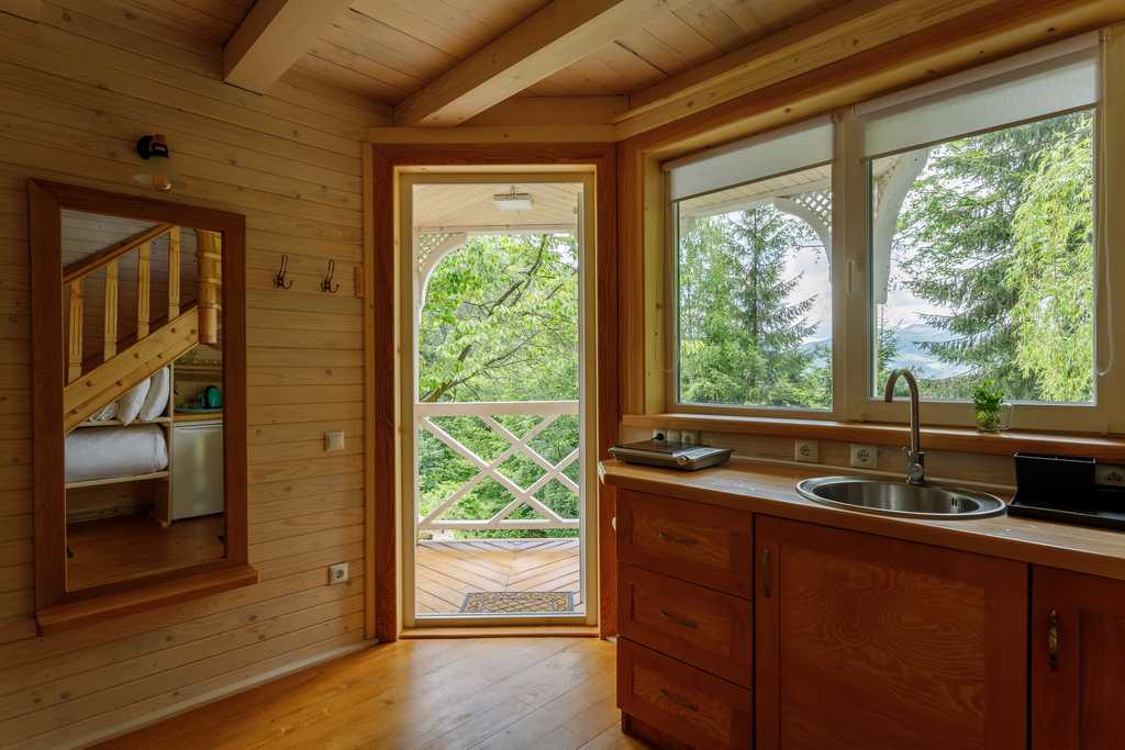 • На першому рівні котеджу є: вихід на відкриту терасу; кухня з видом на гори та ліс; розкладний двомісний диван та санвузол.