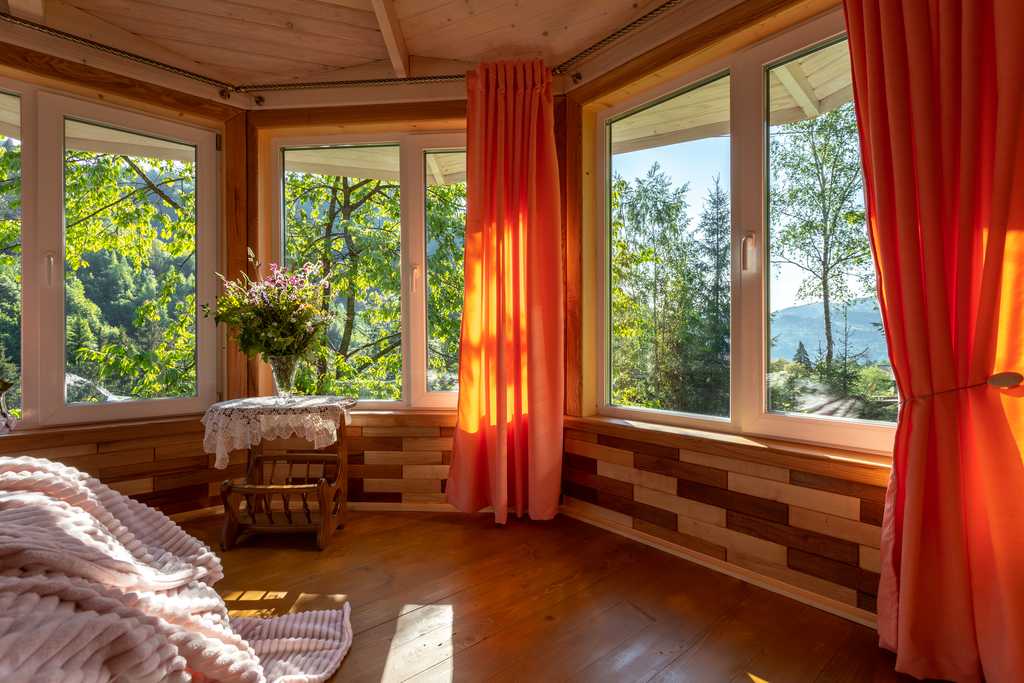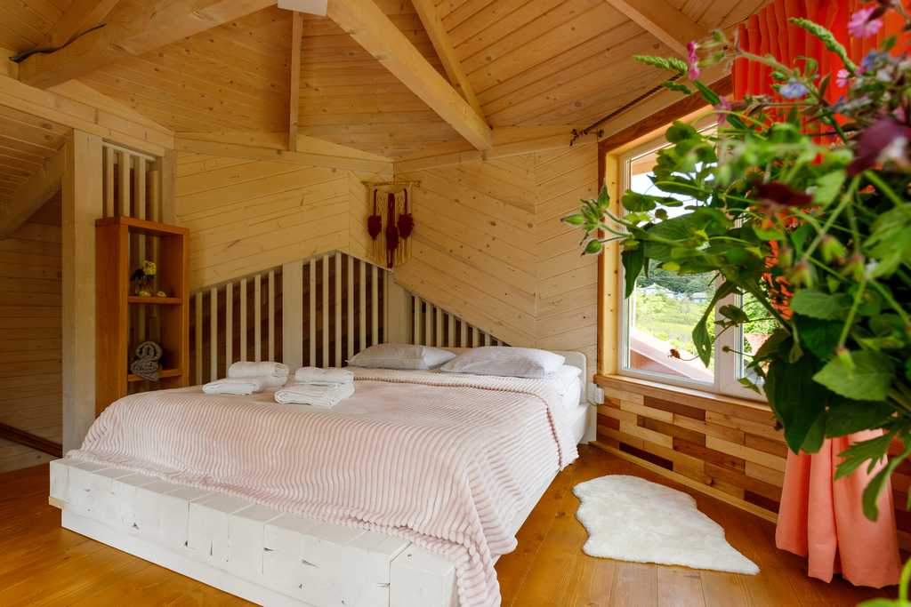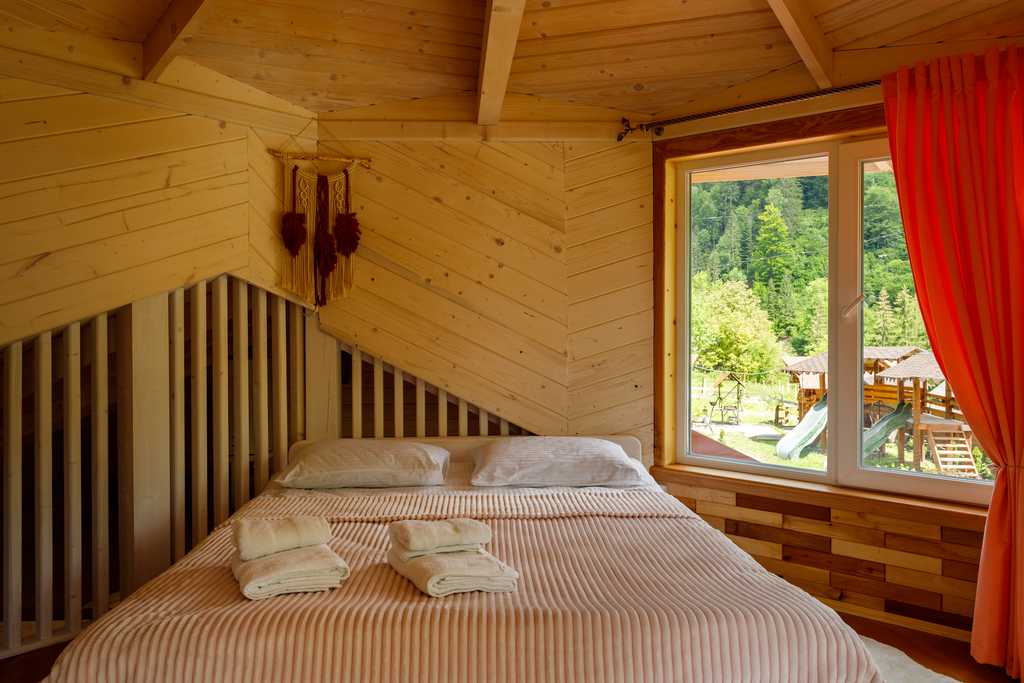 • Котедж складається з 2х рівнів: на другому рівні спальня з двоспальнім ліжком, з якого відкриваєтясь панорама на 180° на гори.