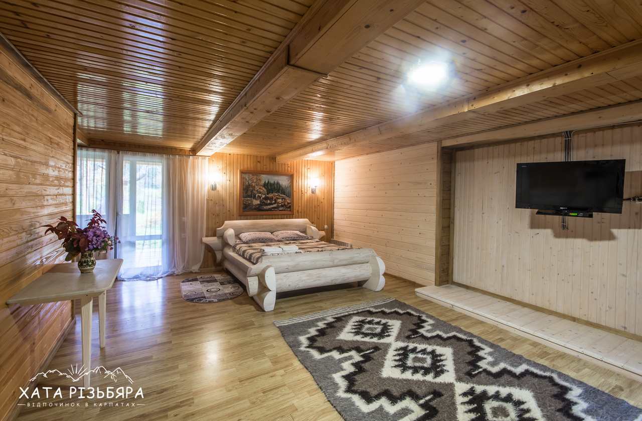 Номер умебльований оригінальним двоспальним ліжком, тумбочками, столиком, вішаком для одягу, телевізором. Є свій санвузол з душовою кабіною, умивальником, унітазом.