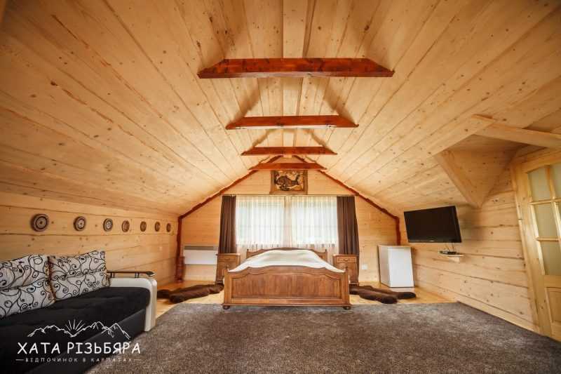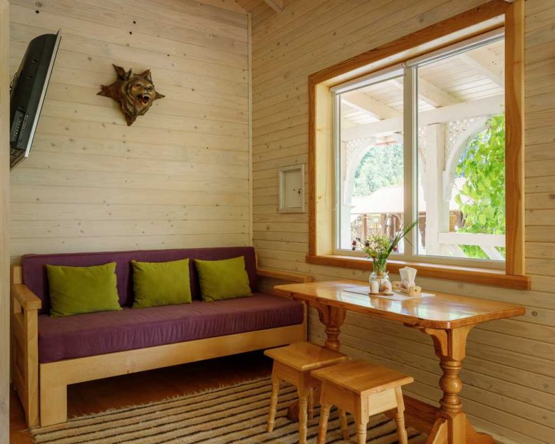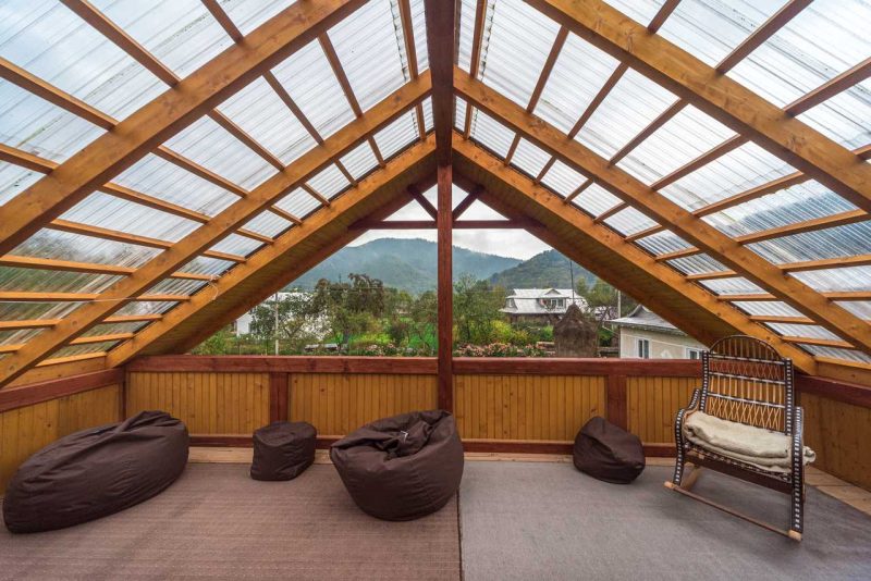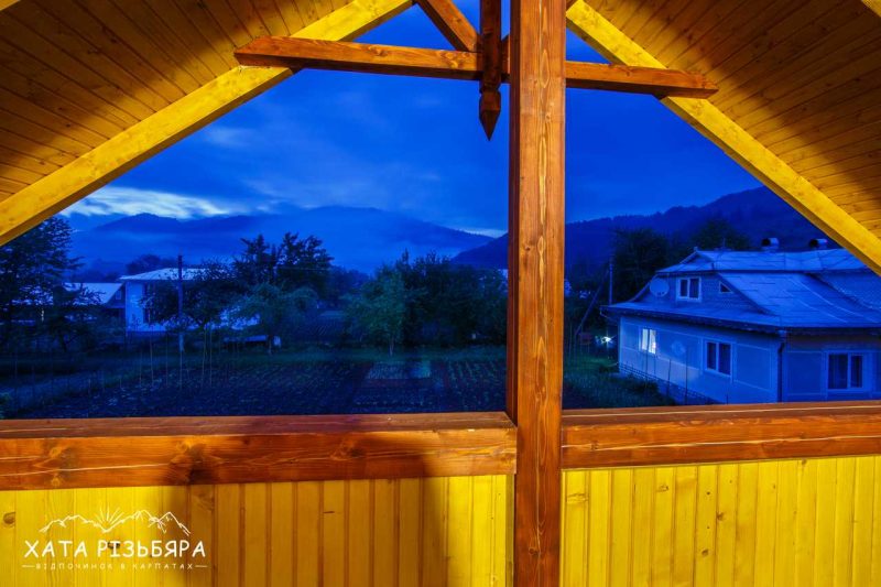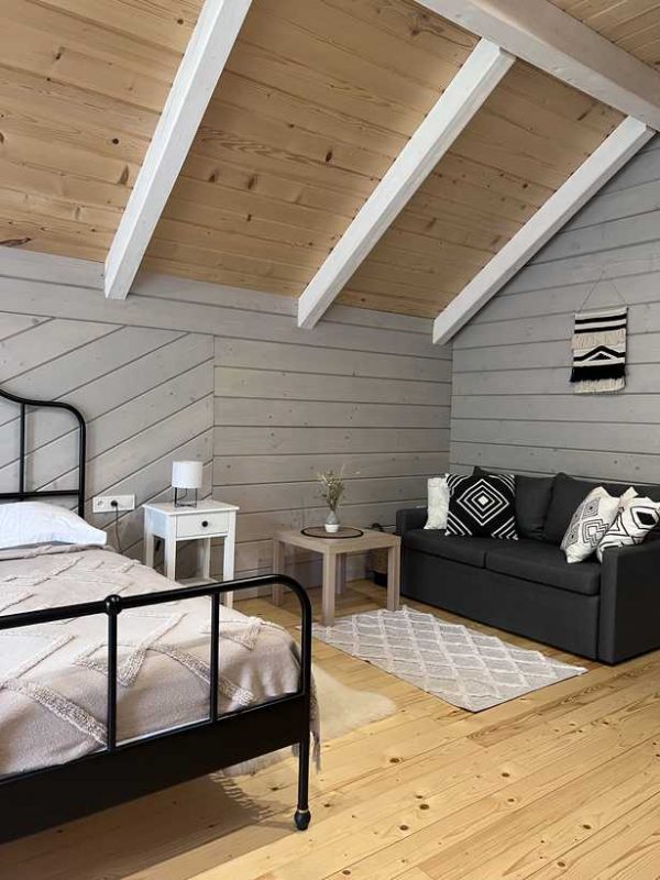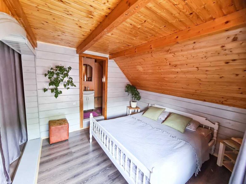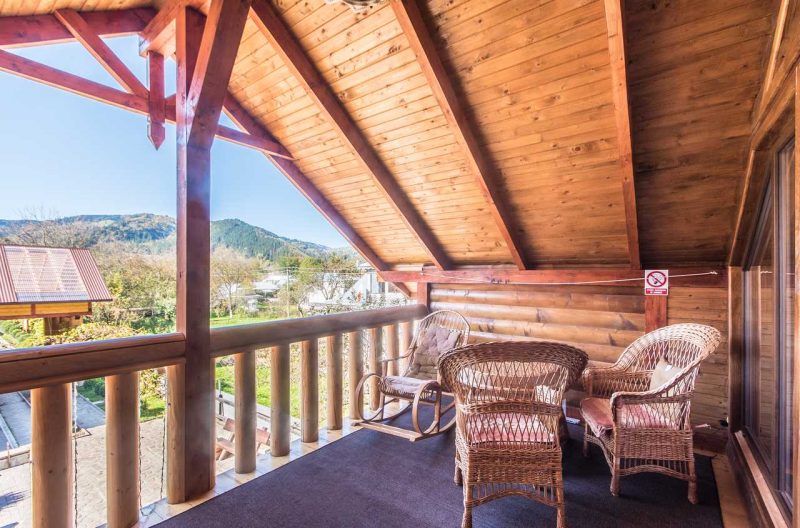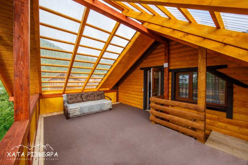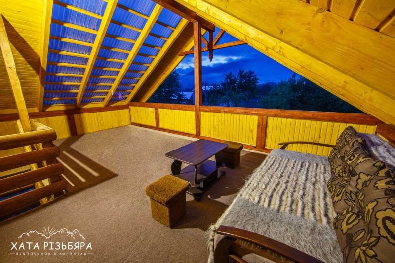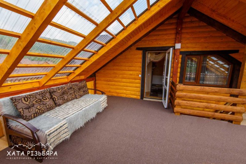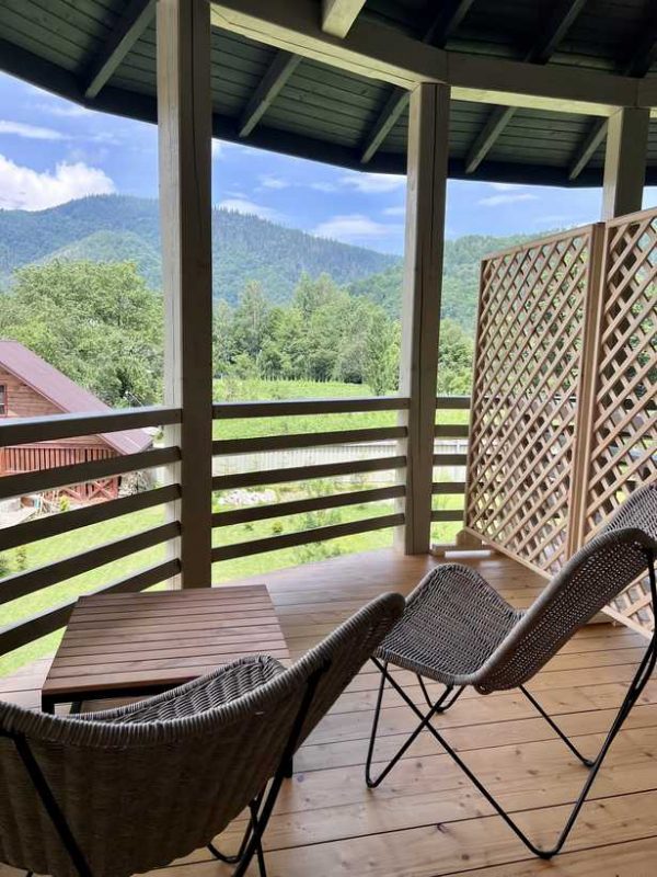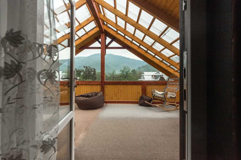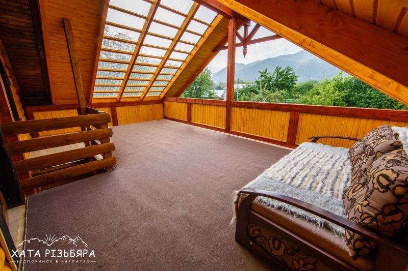 Номер на двох з двоспальним ліжком та власним санвузлом. Окремий вхід через простору відкриту терасу з панорамним дахом та чаруючим видом на гори. Безкаркасні крісла-мішки.