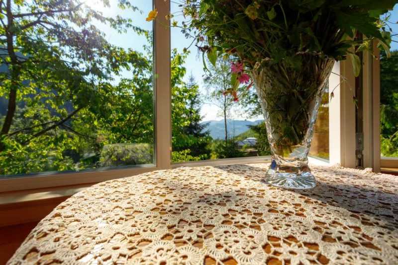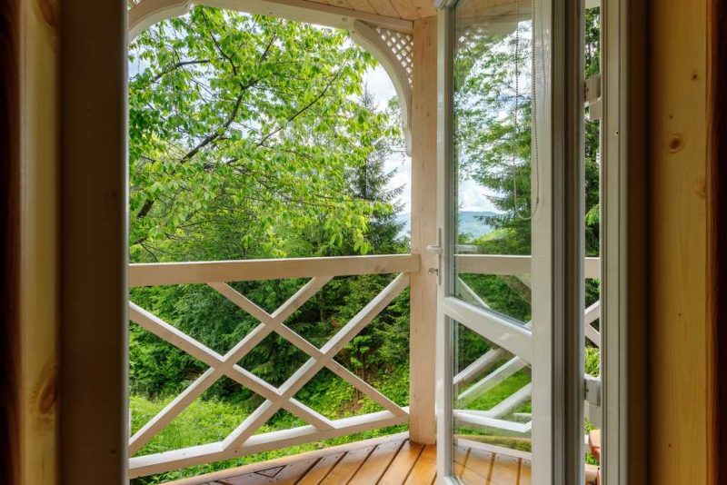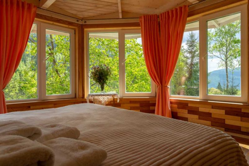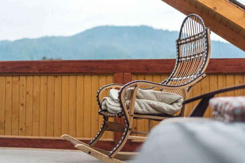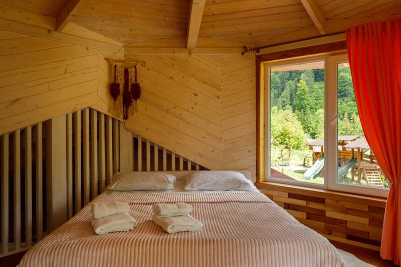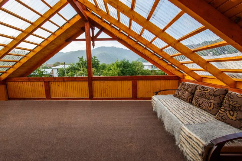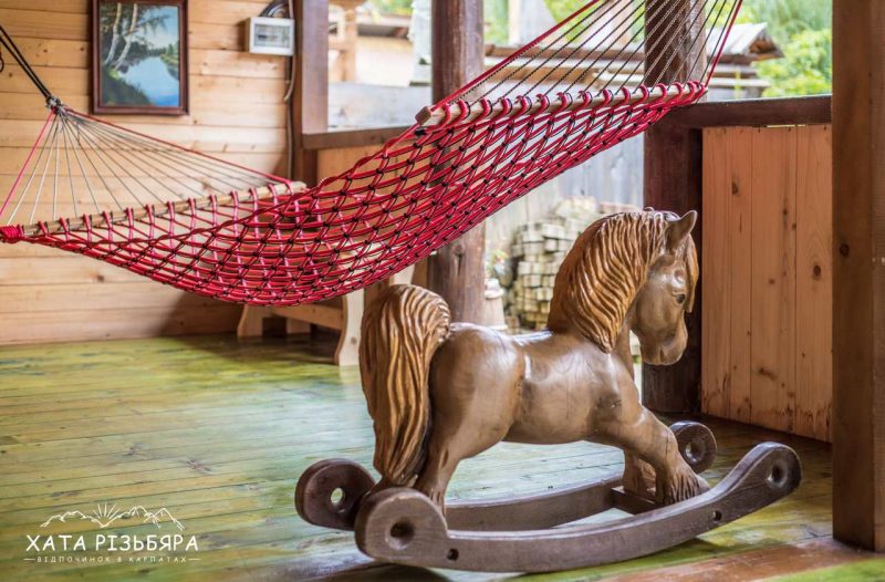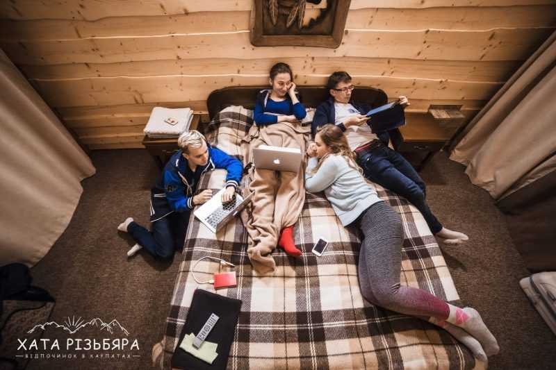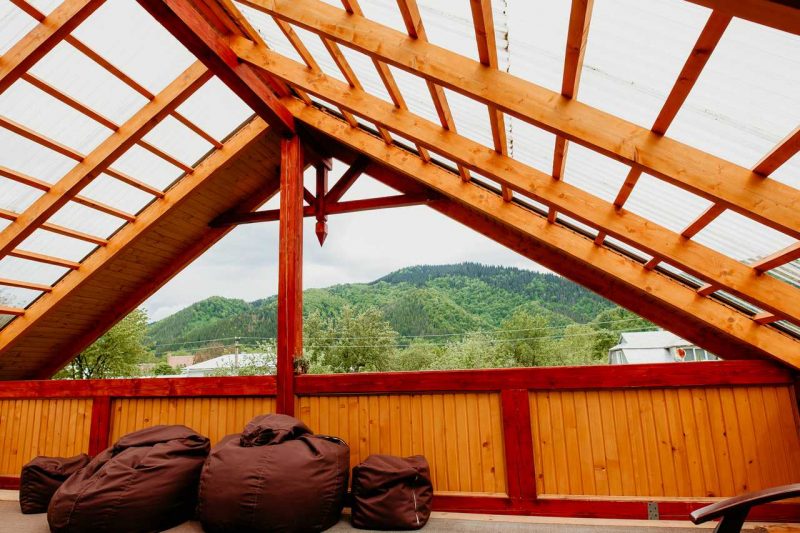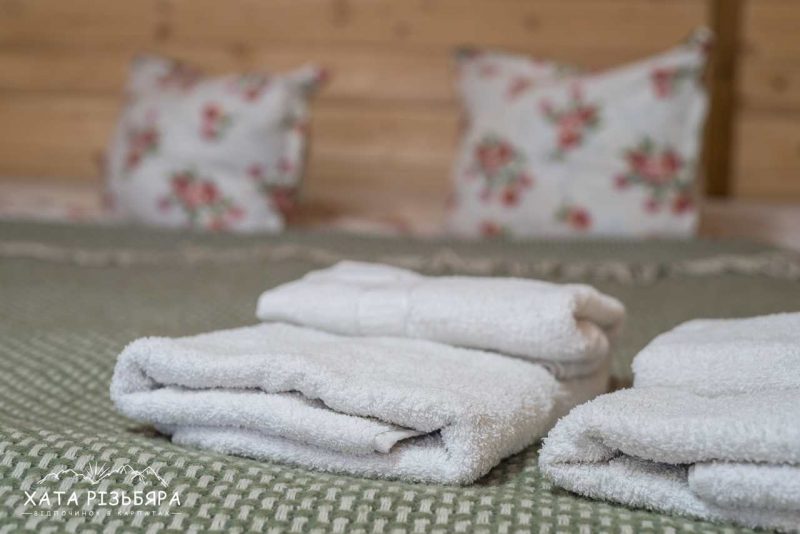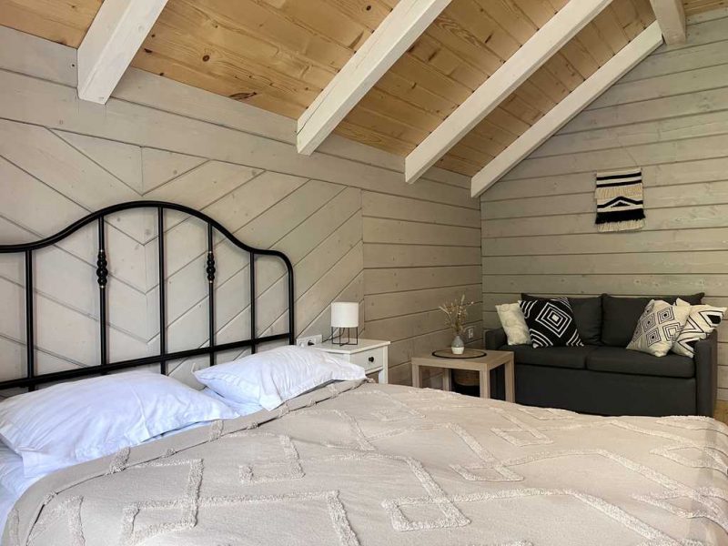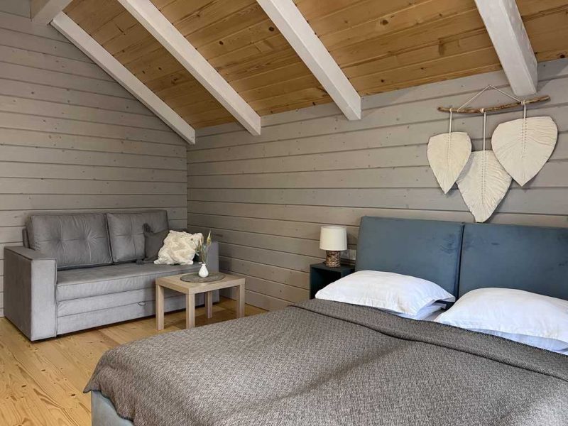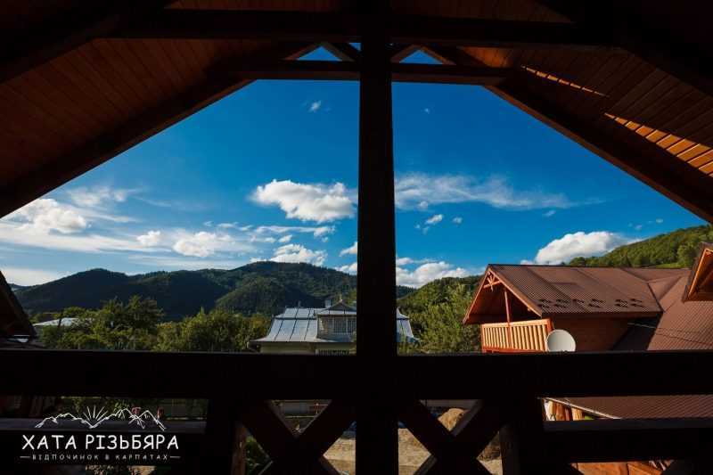 Номер на двох з двоспальним ліжком та власним санвузлом. Окремий вхід через простору відкриту терасу з панорамним дахом та чаруючим видом на гори. Безкаркасні крісла-мішки.