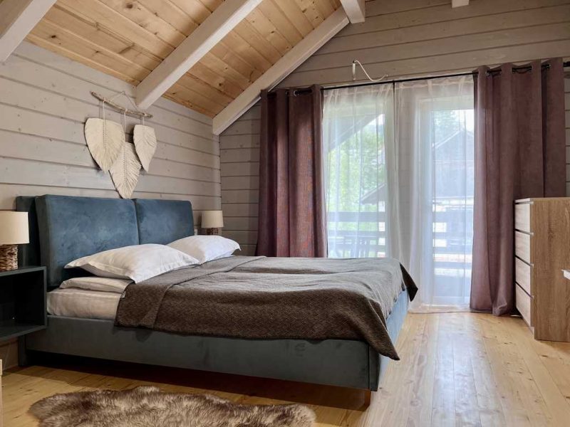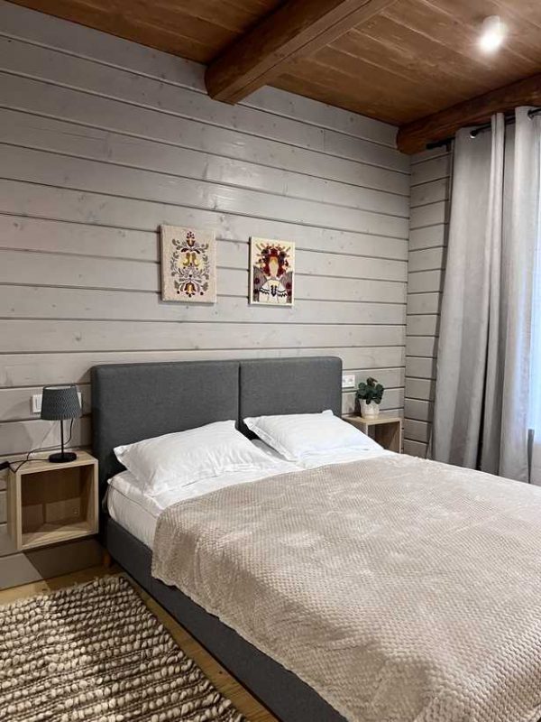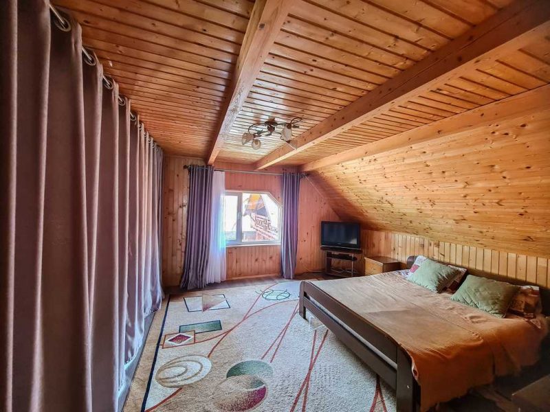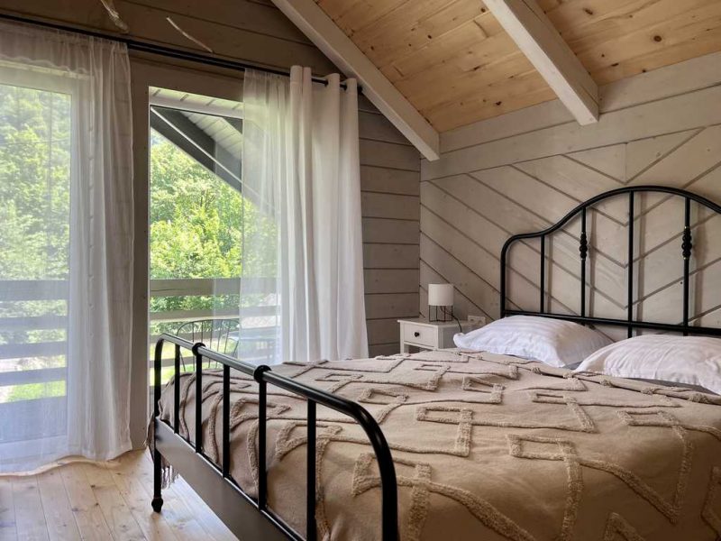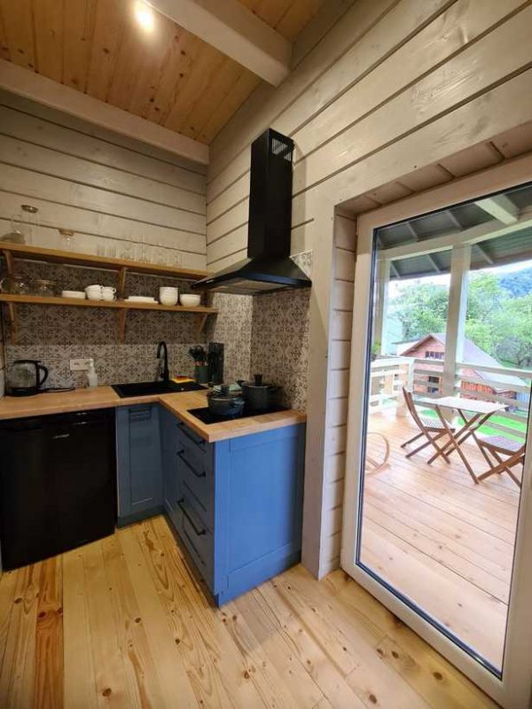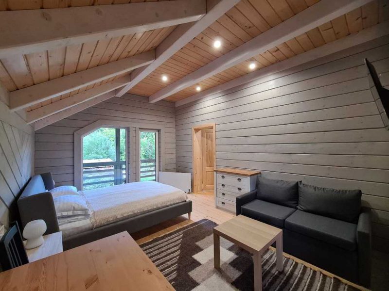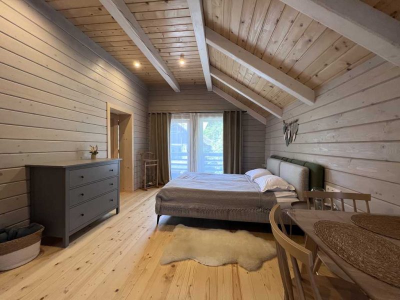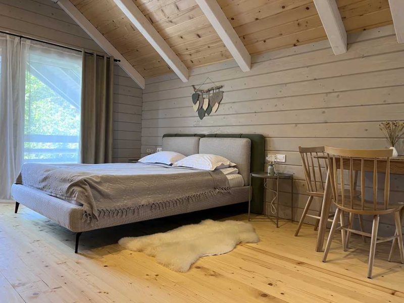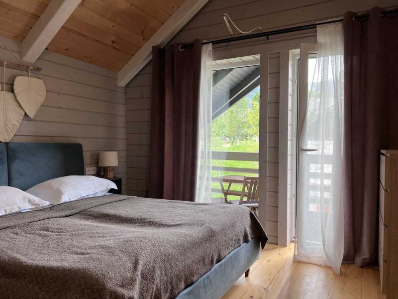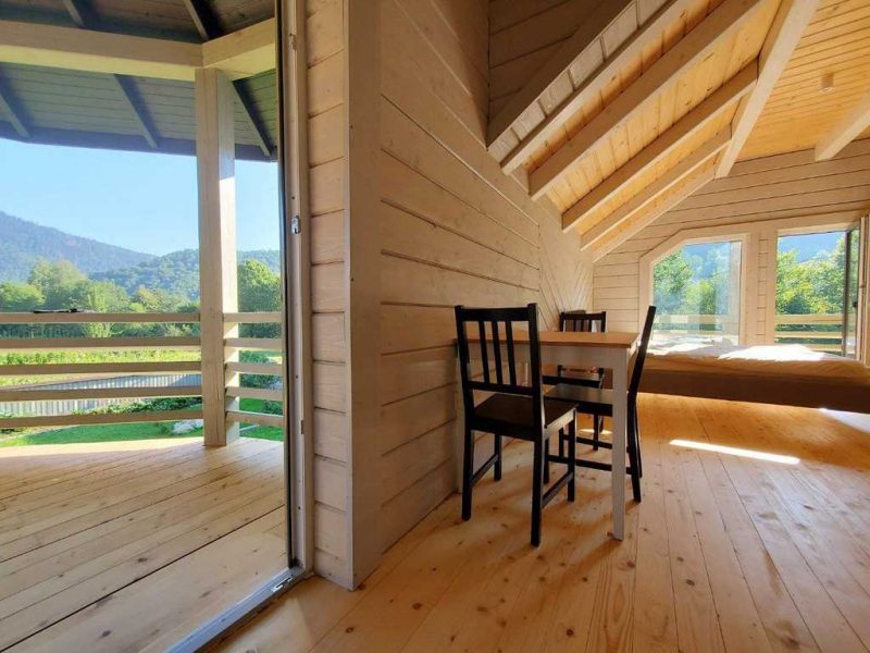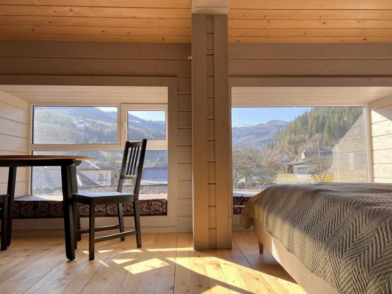 Окремий дерев’яний котедж на 4-6 гостей. Дві спальні зі своїми санвузлами та великими панорамними вікнами з гірськими краєвидами. Кухня-студія з усім кухонним обладнанням. Дві просторі тераси.