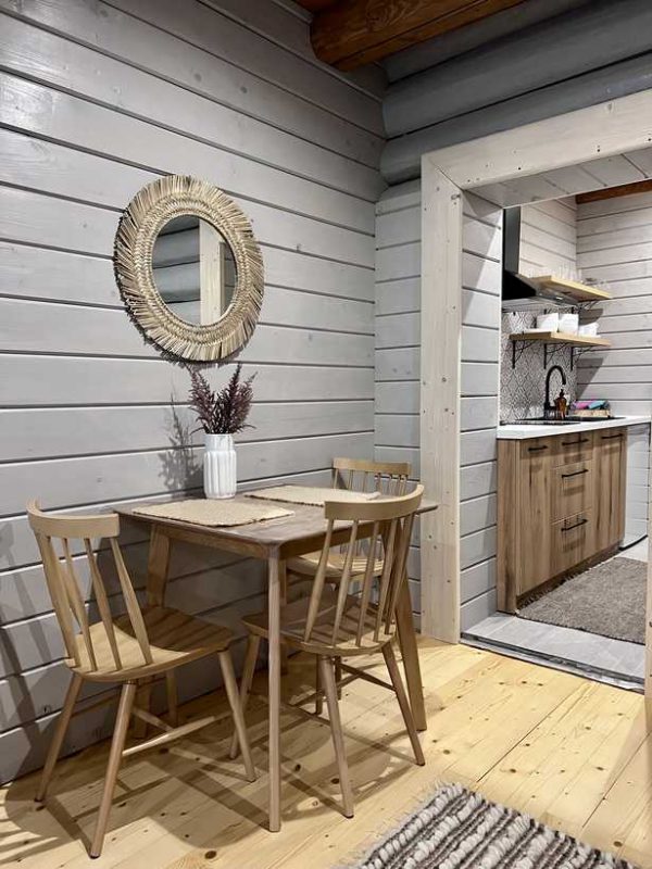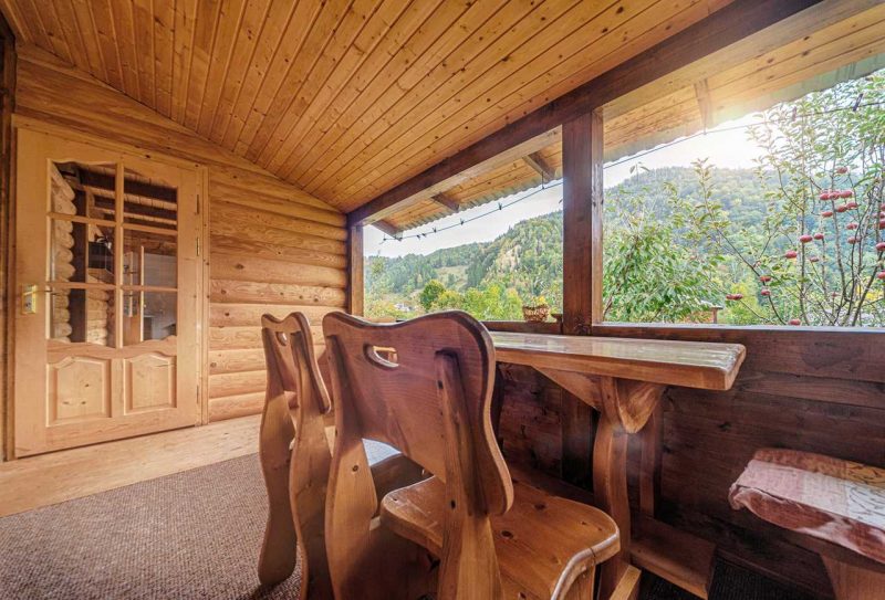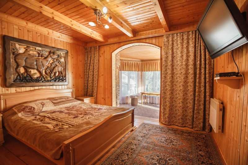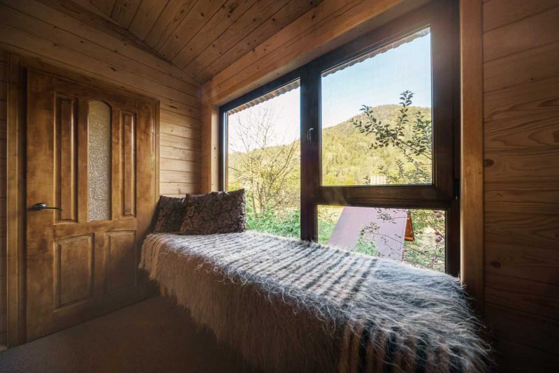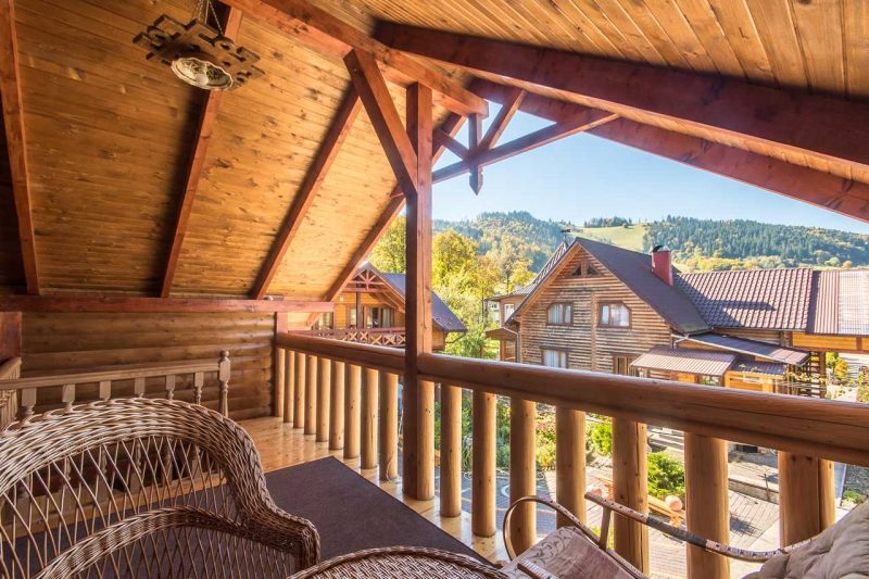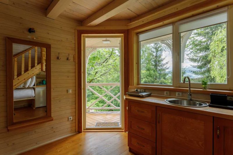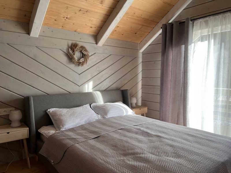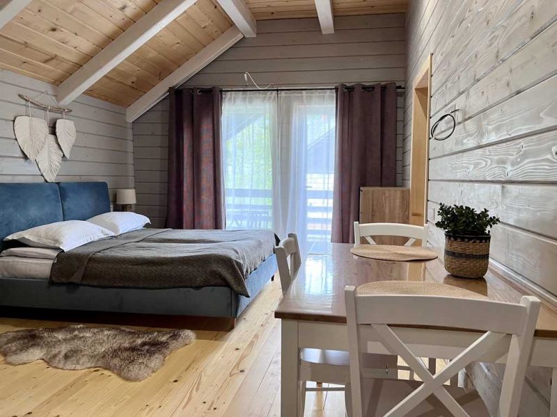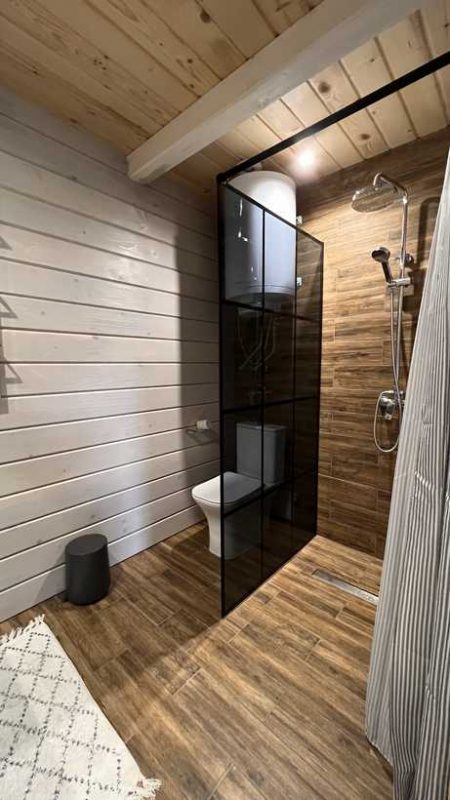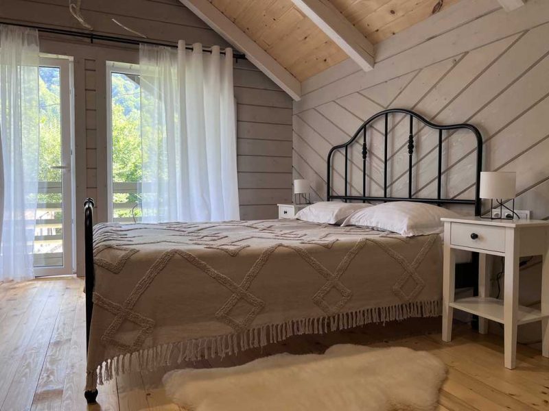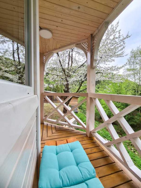 Окремий дерев’яний котедж на 4-6 гостей. Дві спальні зі своїми санвузлами та великими панорамними вікнами з гірськими краєвидами. Кухня-студія з усім кухонним обладнанням. Дві просторі тераси.