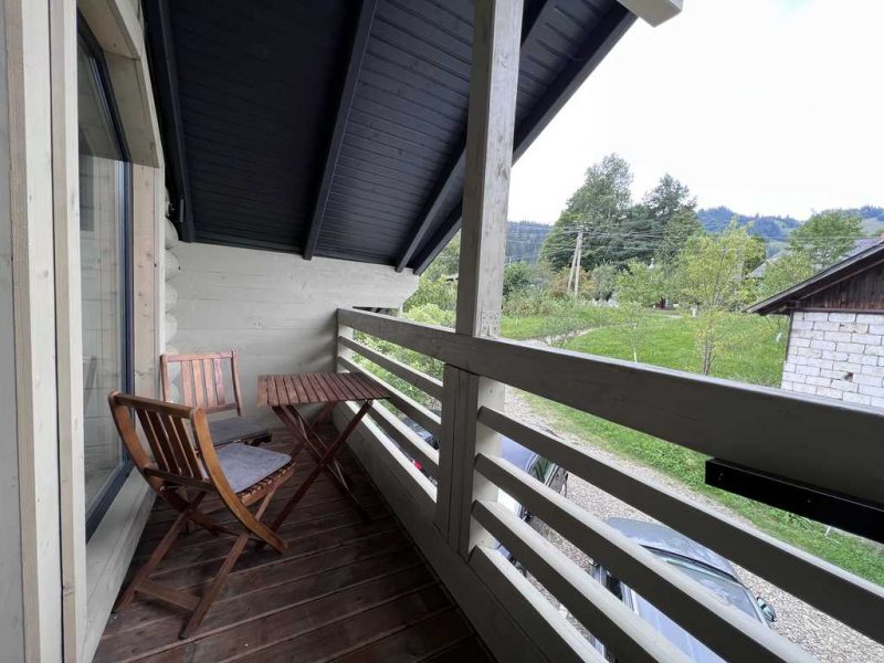 Простора тераса з видом на гори + балкон, 2ий поверх, великі панорамні вікна. 2-4 гостей, свій санвузол, своя кухня. Двоспальне ліжко та розкладний диван.