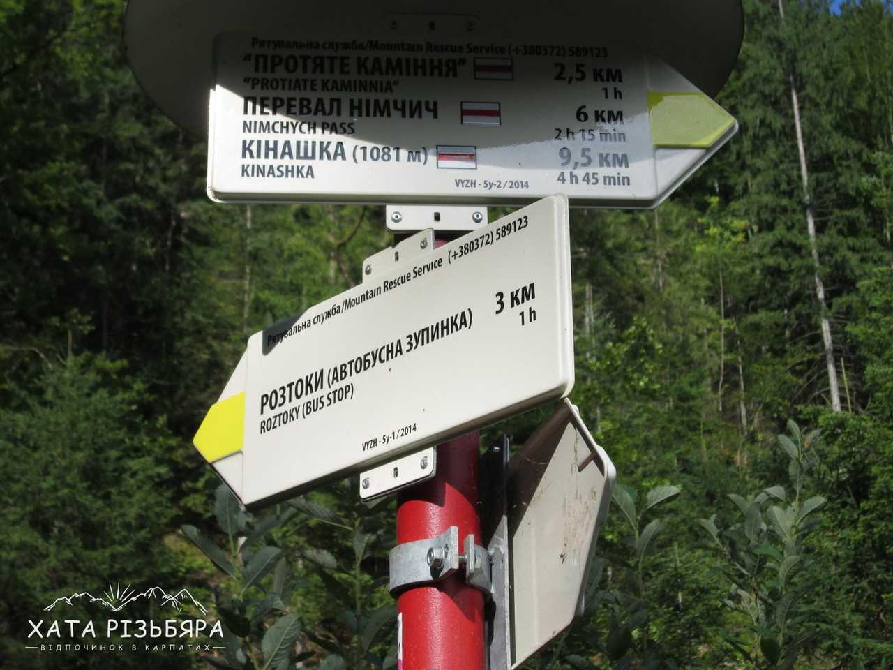 На перевалі фотографуємось, милуємось гірськими пейзажами і вирушаємо по маршруту до Протятого каміння. Йдемо грунтовою дорогою, минаючи гірськолижні витяги, що будуть праворуч. На перевалі рухаємось у сторону каплички, де невдовзі наша стежка порине у затишний тінистий ліс.