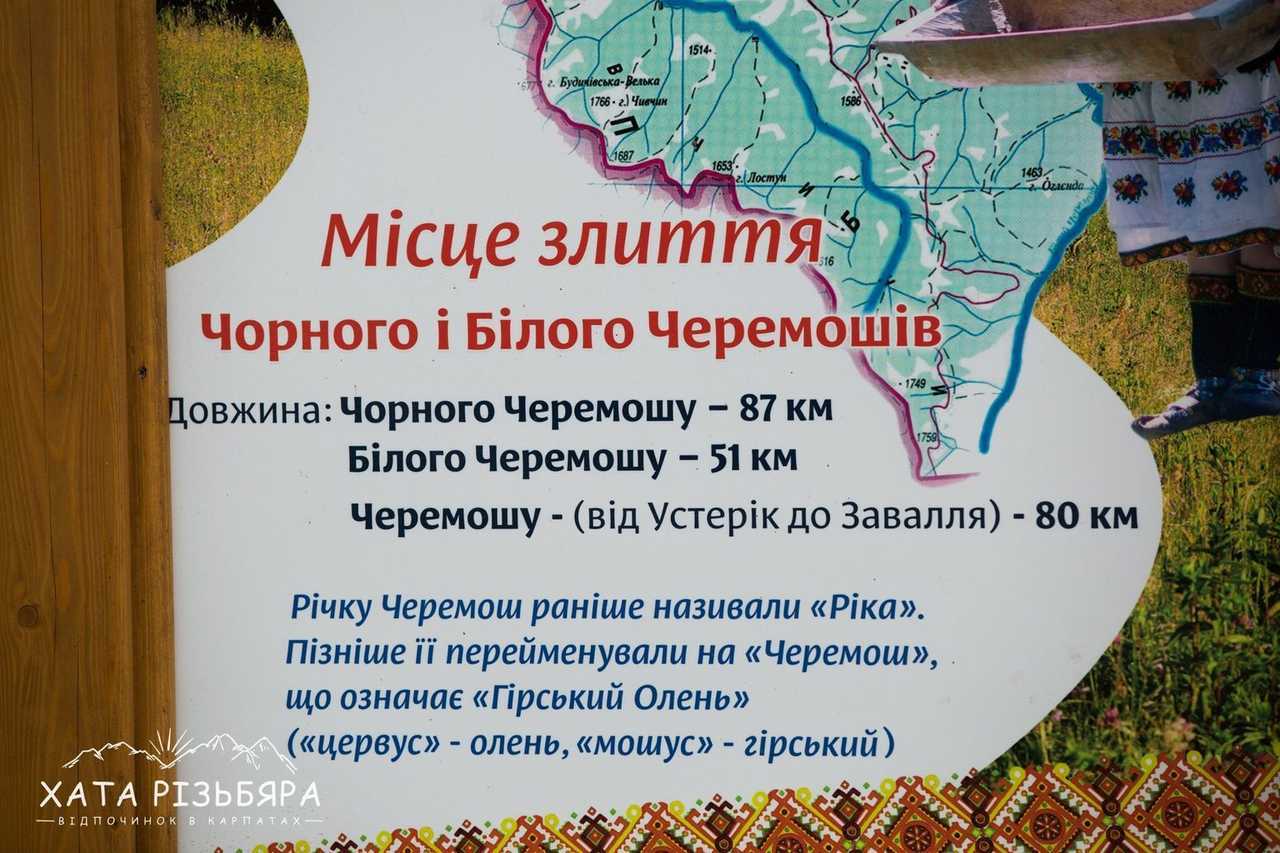 Черемош бере свій початок у селі Устеріки, недалеко від Білоберізки. Саме тут з’єднуються дві ріки: Білий та Чорний Черемош. За гуцульським повір’ям Білий Черемош несе води зі світу добрих Богів, світу Прави, а Чорний Черемош витікає з потойбічного царства Нави.
