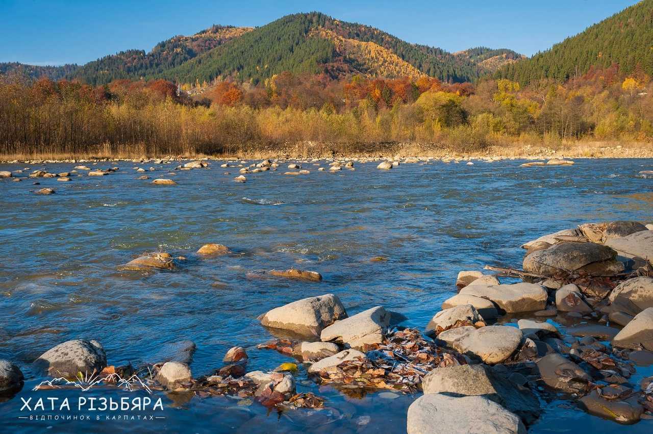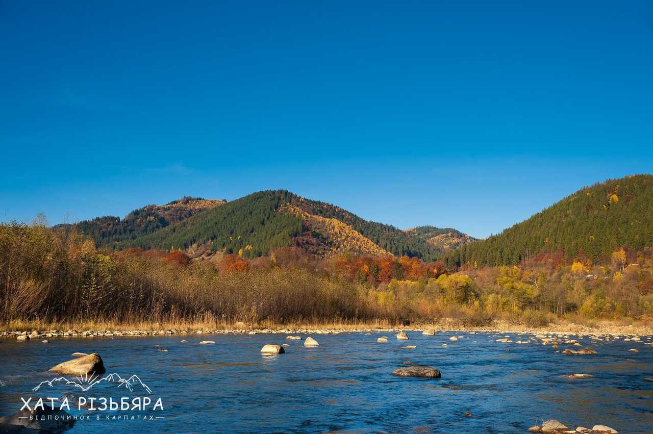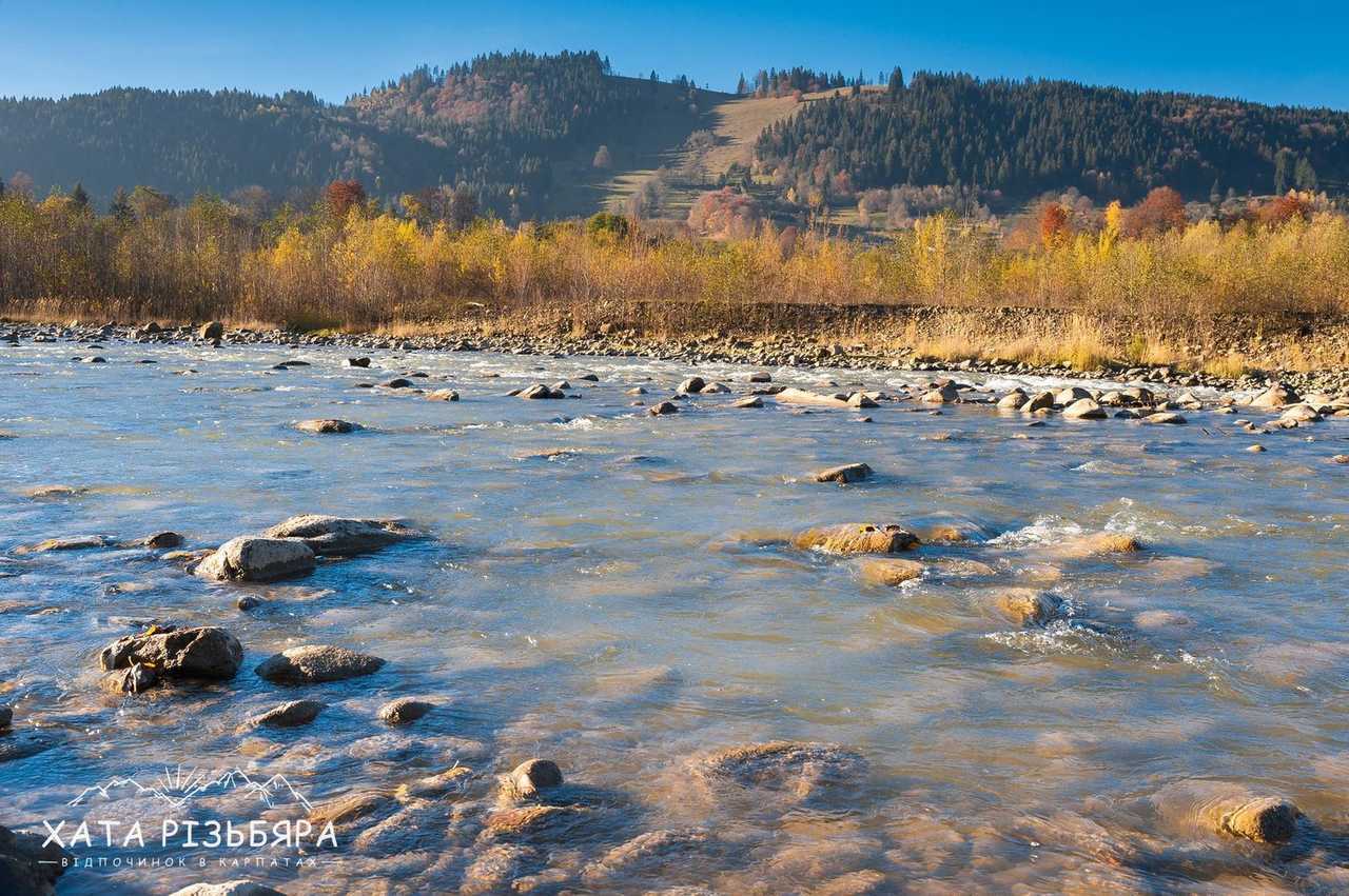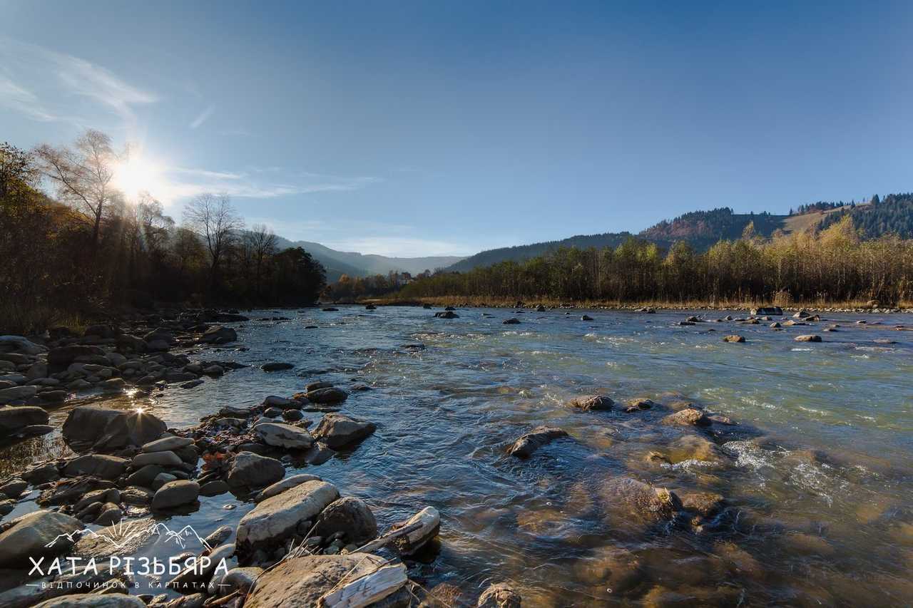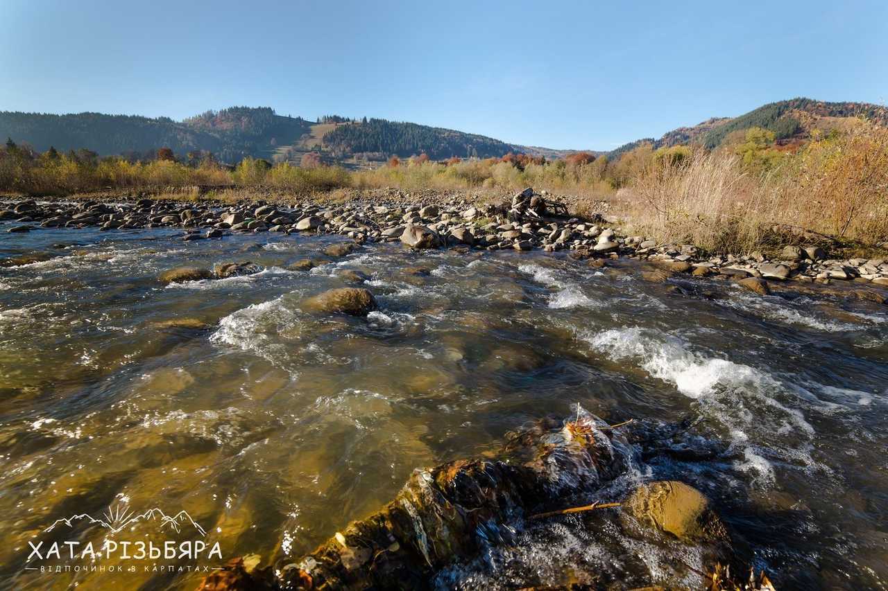 рівень складності 1 Коли відпочиваєш в Карпатах і доста нагуляєшси по горбах, то хочеться гарно погрітися на сонечку біля води. Завдяки наявності водойми, туристові додається ще цілий ряд атракцій: рибалка, пляж, рафтинг, фотосесії, неповторні заходи і світанки. Як файно, що вже за 100 метрів від садиби «Хата Різьбяра» біжить потоком річка Черемош.