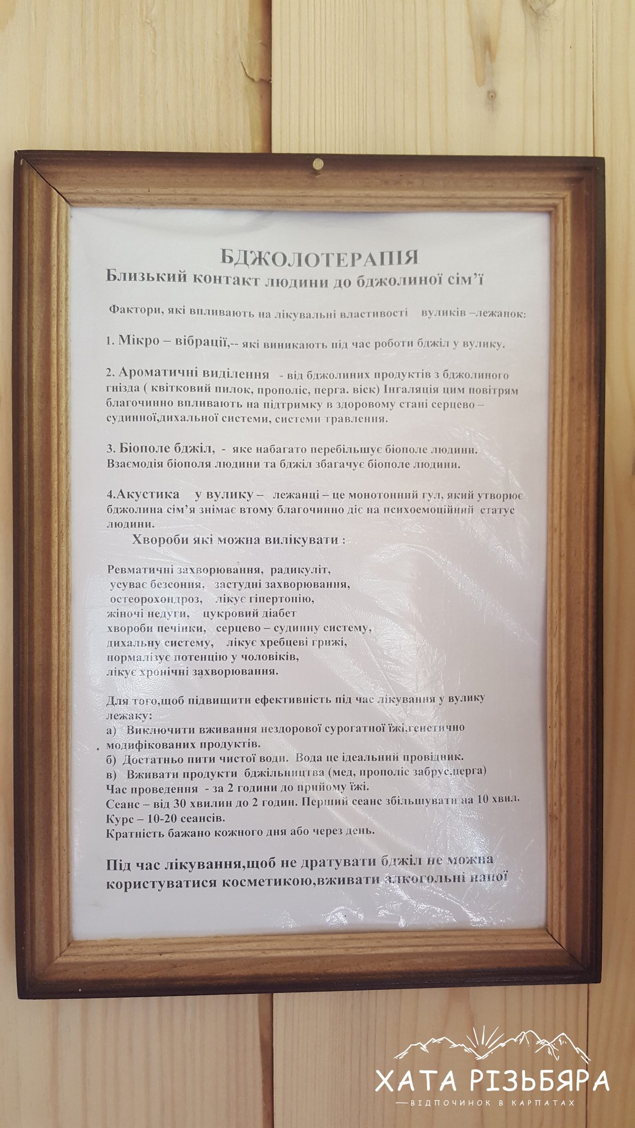 Відразу варто сказати, що боятись немає чого. Бджоли до хатки потрапити не можуть, вулики оснащені виходами лише назовні. Водночас суміш вібрації крилець, аромату та звуку створюють позитивне лікувальне середовище і занурюють відвідувача у здоровий сон-медитацію.